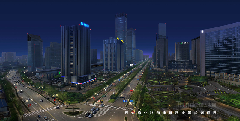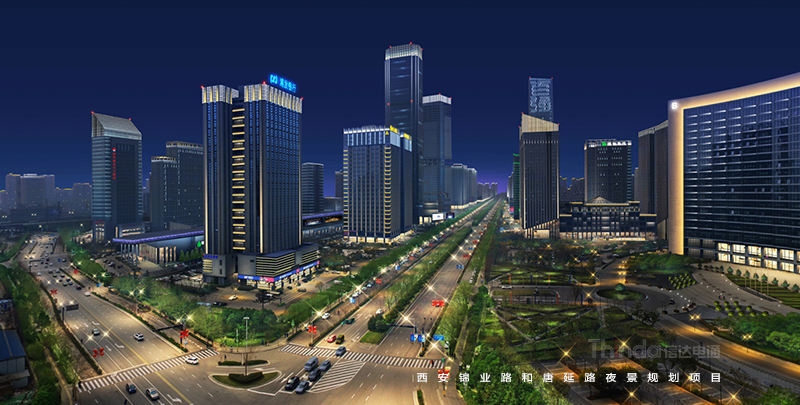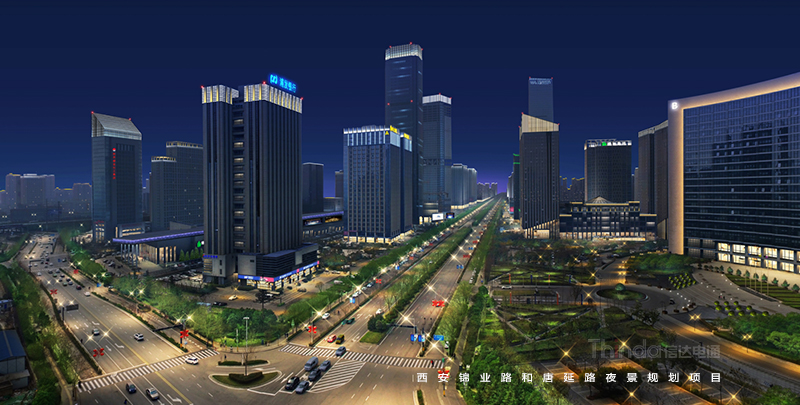 本項為西安高新區建筑景觀照明規劃設計中的一部分,地處于唐延路南與錦業路東交叉口,該視角可見建筑有都市之門、浦發銀行、綠地智海大廈、綠地筆克國際會展中心、陜西煤業化工集團、領海大廈、中鐵航空港假日酒店等,是高新區錦業路南端的重要位置,當車輛、行人抵達該位置時,視角寬闊夜晚可視范圍大,夜幕下的燈光也就更為重要。